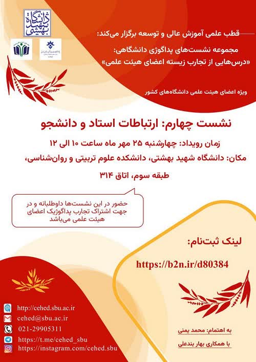 نشست علمی با عنوان «ارتباطات استاد و دانشجو» ویژه اعضای هيئت علمی، چهارشنبه 25 مهر 1403 برگزار می‌شود.