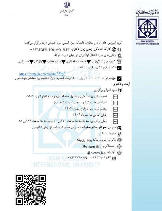 گروه آموزش های آزاد و مجازی دانشگاه بین المللی امام خمینی (ره) طبق سنوات قبل در نظر دارد، در زمستان 1403 دوره آمادگی آزمون زبان دکتری، را به مدت 80 ساعت ( 2 ترم 40 ساعته) و به صورت غیر حضوری با استفاده از سامانه آموزش الکترونیکی https://lms.ikiu.ac.ir برگزار نماید.